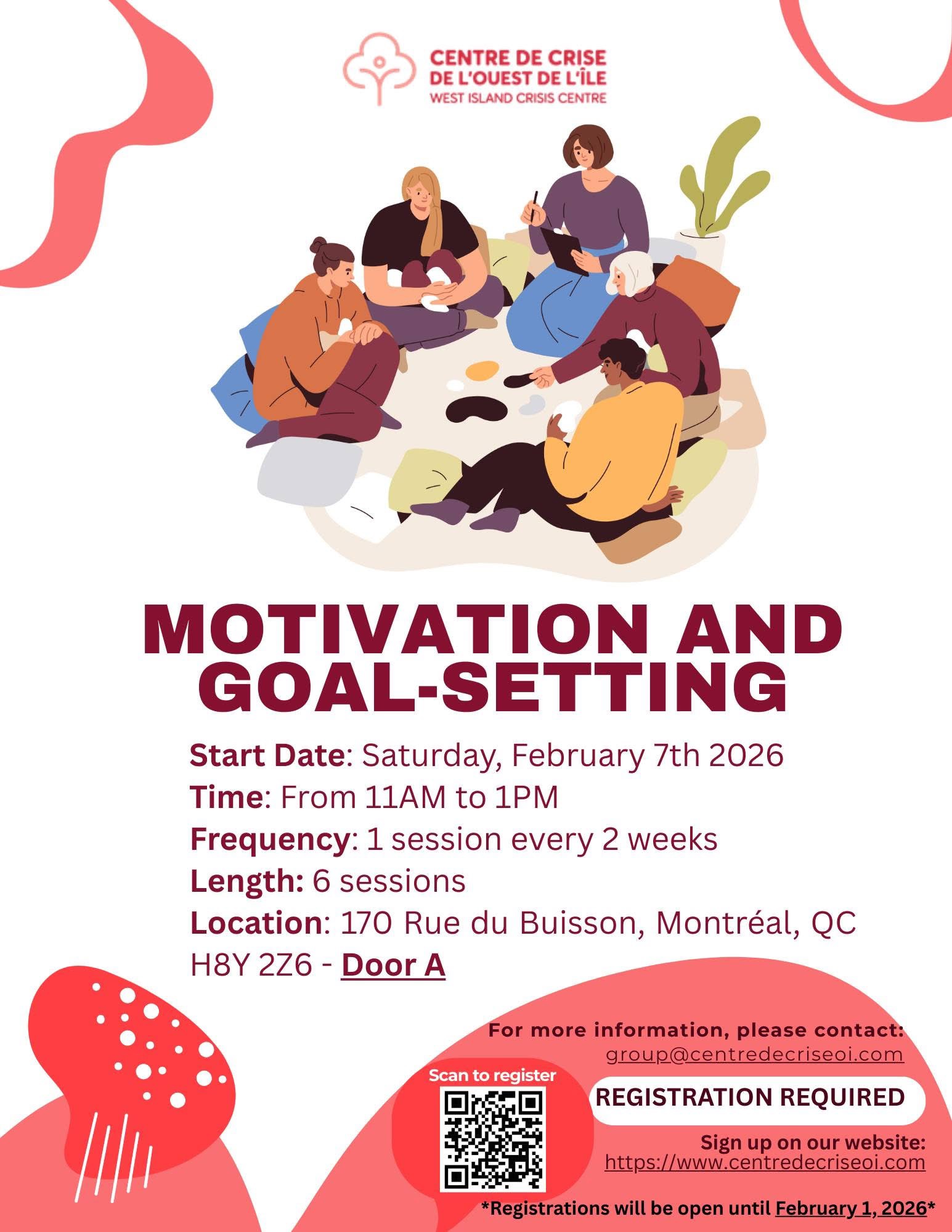 The West Island Crisis Center is offering a new support group focused on motivation and goal setting. Participants will have the opportunity to explore different types of motivation, learn how to set realistic goals (including SMART goals), and discuss concepts such as self-compassion, kindness, and self-esteem. Learn more here.